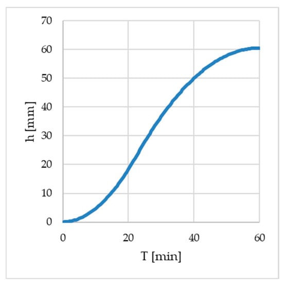 Every simulation applied the same 60 mm rainfall event, distributed uniformly over the watershed. The event lasted 1 h, with a triangular intensity distribution, peaking at 37.5% of the total duration. Figure 4 presents the cumulative rainfall depth curve.