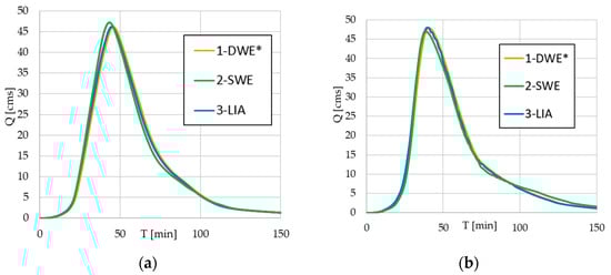 The variation in peak flows, with or without obstructions, was minimal. Previous studies [] suggested that more straightforward methods might underestimate peak flows; however, this study found no significant differences, even when using the DWE method (except in cases of instability, indicated in italics).