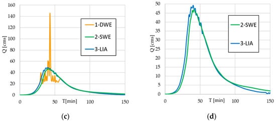 This group comprises solutions 1-DWE, 2-SWE, and 3-LIA, with no LES on a 2 × 2 m mesh. The three watersheds (W1, W2, and W3) contained no obstacles. Each outflow time series appears according to their watershed. Figure 5 shows the outflow time series for solutions 1, 2, and 3 in W1 (Figure 5a) and W2 (Figure 5b), while Figure 5c,d shows the results in W3. The time series marked with (*) indicates a shift of 1 min to the right, revealing the plot line better.