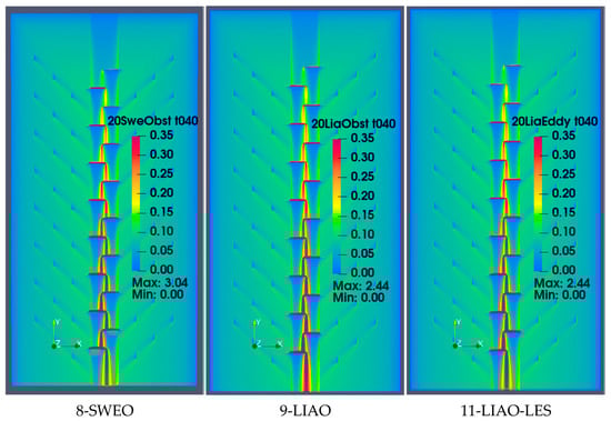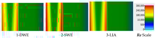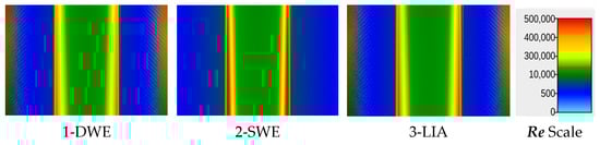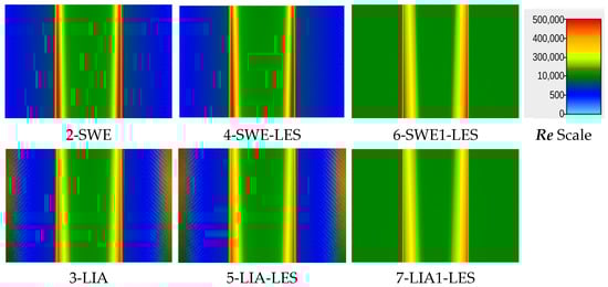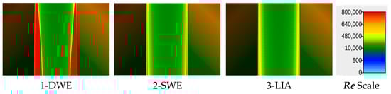 where Re is the Reynolds number, V is the flow velocity, h is the water depth, and ϑ [m2/s] is the water’s kinematic viscosity with the value of 10−6. The Reynolds number distributions across different simulation methods highlighted the similarities and differences, quantifying the regions of turbulence.