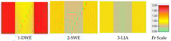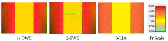 The HEC-RAS software records maximum Fr distributions for the 2D unsteady flow event. This study explored the connection between solution performance, equation accuracy, and the areal distribution of the Fr. According to Almeida and Bates [], the accuracy of the LIA model can be closely linked to the Fr, which characterizes the flow regime. The flow is subcritical when the Froude number is less than 1 (Fr < 1). At Fr = 1, the flow is at a critical depth, and when Fr > 1, the flow is supercritical, moving faster than the wave propagation speed. Most of this study’s simulations expected supercritical flow (Fr > 1). The critical questions regarding the Froude number in this study were as follows: