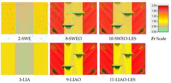Table 1 summarizes each solution’s key attributes, including the solver type, LES inclusion, obstacle presence, and mesh size. The LES performance varies with cell dimensions (in Equation (4), the Δ value represents the length through a cell). Both the SWE and LIA solutions employed 2 × 2 m and 1 × 1 m cells to assess their effect on the accuracy of their predictions. Consequently, the total grid size increased from 500,000 to 2,000,000 cells. According to [], LES inclusion can cause overcomplexity due to the nonlinear part of the SWE equations and result in less stable and accurate predictions. Overcomplexity may cause oscillations in the outflow predictions and erratic patterns in the Froude and Reynolds number distributions. Table 1 summarizes the scenarios for the different solvers.
