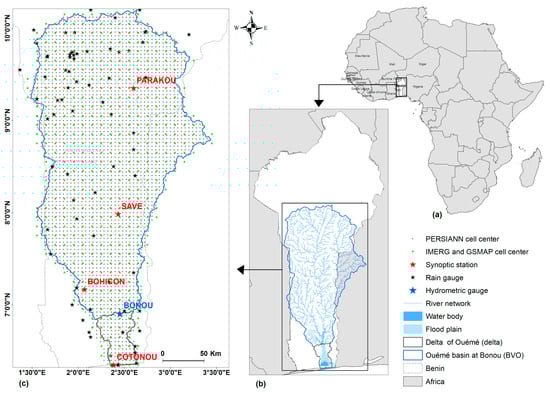 Map of the study area showing: (a) Benin in Africa, (b) the study area in Benin with hydrographic network, floodplain and water bodies, (c) the study area with ground-gauges location and center of satellites products grid cells with PERSIANN in gray, and IMERG and GSMAP in green.