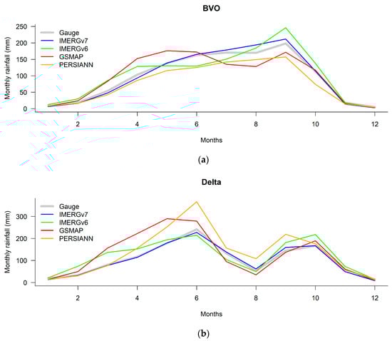 Seasonal rainfall cycle according to data from ground gauges (gray), IMERGv7 (blue), IMERGv6 (green), GSMAP (red) and PERSIANN (orange) during the period of 2001–2018 (a) in the Ouémé basin at Bonou outlet and (b) in the delta.