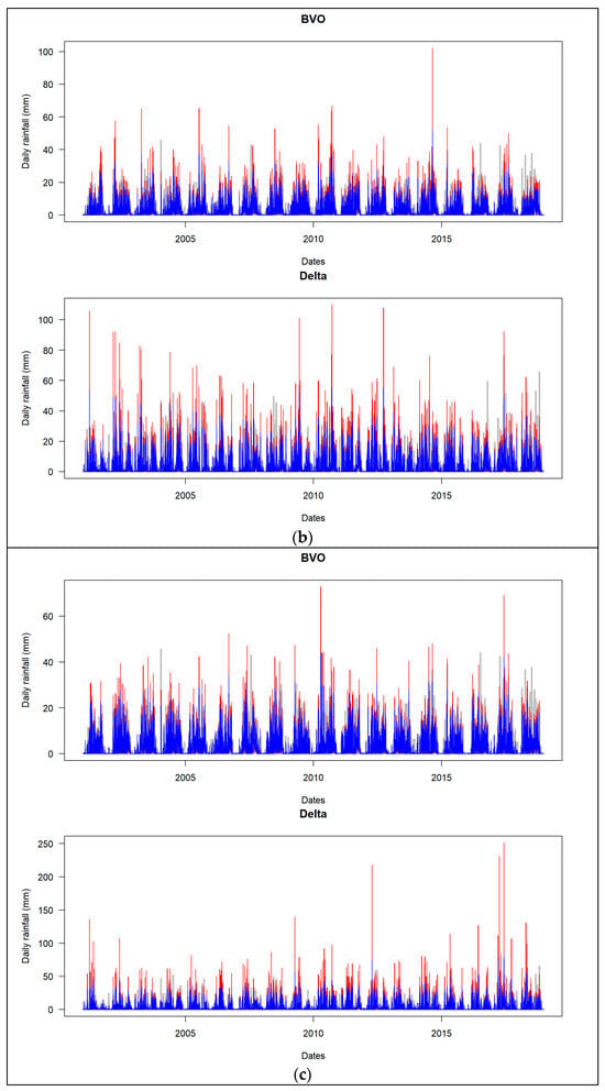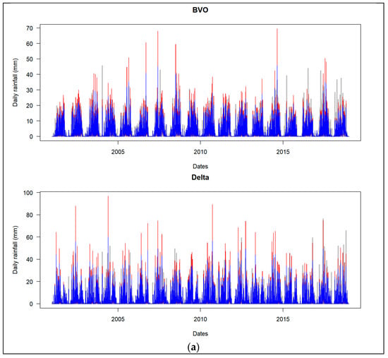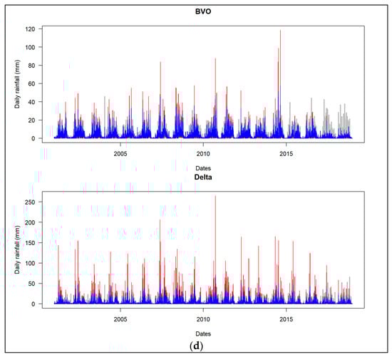 Line plots showing ground-based daily rainfall (gray), uncorrected (red) and corrected (blue) daily satellite rainfall estimates. They are plotted in each subdomain (BVO, delta) for each product, namely (a) IMERGv7, (b) IMERGv6, (c) GSMAP and (d) PERSIANN.
