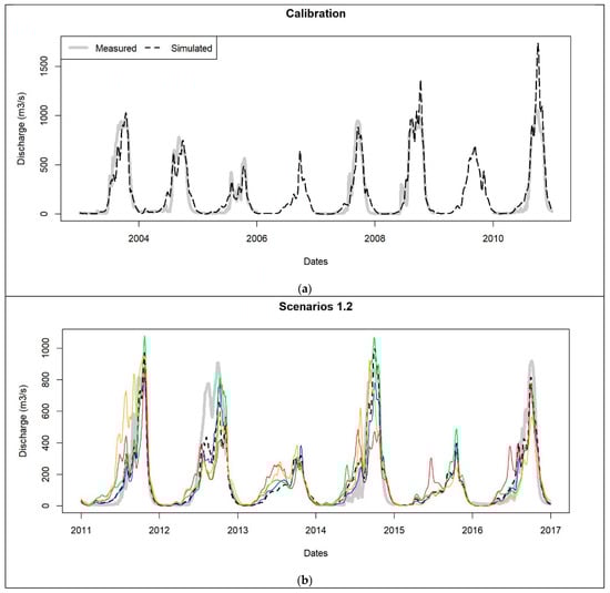 The criteria for the performance of hydrological scenarios are reported in Table 8. Their hydrographs are presented in Figure 6 for scenario 1.1 and its variants 1.2 and 1.3 and in Figure 7 for the satellite data-based simulations.