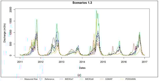 The hydrograph from IMERGv7 in scenario 1.3 matches better the reference hydrograph. But, similarly to IMERGv6, its hydrograph from scenario 1.2 has better agreement with the hydrograph of measured flow and does not overestimate the peak flows as observed in scenarios 1.1 and 1.3. In both scenarios, the simulated hydrographs from GSMAP and PERSIANN datasets generally underestimate the peak flows and show less agreement with the reference hydrograph or the measured hydrograph, especially in the case of uncorrected data.