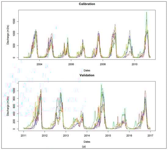Spatialized rainfall, mean temperature (computed from maximum and minimum daily temperature) and potential evapotranspiration (ETP) calculated using the Hargreaves method by the Evapotranspiration package on Rstudio [] are used to run the model in the current study. The discharge of the Ouémé River basin at the Bonou outlet is needed as a reference for model calibration. The model calibration was conducted in the first place manually by playing around parameters. The first set of parameters obtained serves as the base for automatic calibration using the GAP (Genetic Algorithm and Powell) optimization tool to define the set of parameters for better model efficiency. The model was calibrated from 2001 to 2010 (no data measured in 2006 and 2009) and validated from 2011 to 2016.