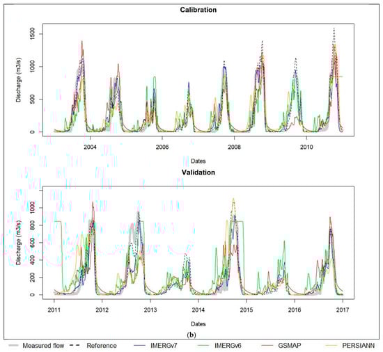 The main limitation of the hydrological modeling is the consideration of the Ouémé basin as a single entity with average characteristics, whereas its climatic conditions, vegetation cover and soil vary widely in space. Further, a proper model sensitivity was not carried out. It is also worth pointing out that the scarcity of ground-based data is a factor that limits the score of efficiency when assessing satellite-based data ability in quantifying rainfall as well as in flow simulations. In addition, since the comparison in this paper is areal rainfall-based, the difference in the area of the two subdomains of interest did not allow us to conclude about the elevation-dependent performance of the products, which is another cause of the spatially varying reliability of satellite products []. These limitations provide perspectives for future studies and suggest carrying out ground-based measurement campaigns to increase the reliability of the results. The hydrodynamic modeling-based assessment remains to be considered.