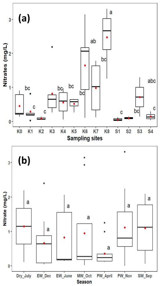 Spatial nitrate (a) and temporal nitrate (b) concentrations range in the lower Kagera River. Seasons indicated are end wet (EW), mid wet (MW), SW (start wet) and peak wet (PW). The red dot shows the mean, black dot shows values above the values beyond the 1.5 interquartile range, and the dark line shows the median. Boxplots with different letters show ANOVA outputs indicating significant differences (p < 0.05) using the Tukey HSD test.