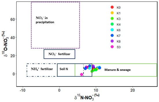 The spatial proportion contributions for manure and sewage were highest at S3 (73%) and lowest at K8 (49%), in the order S3 > K1 > K3 > K7 > K6 > K7 > K8 (Figure S1). Ammonium-based fertilizers were the second nitrate contributor, with K0, K8, and K6 (24%) having the highest and S3 having the lowest contribution. Soil N was third, with K8 having the highest contribution and S3 having the lowest contribution. The contribution of nitrate-based fertilizers was in the range of 1–3%, while nitrates in the precipitation were in the range of 1–2%.
