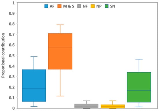 Proportional contributions of primary NO3− sources across all sampled sites in the lower Kagera basin. Boxplots show the 25th, 50th, and 75th percentiles, while whiskers illustrate the 5th and 95th percentiles. M & S is manure and sewage, AF is ammonium-based fertilizers (urea), NF is nitrate-based fertilizers (NPK mixtures), SN is soil nitrogen, and NP is nitrate in precipitation.