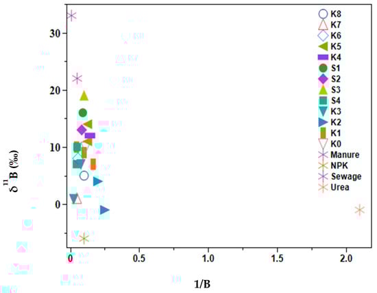 Biplot of δ11B against 1/B of selected lower Kagera River basin samples and source samples.