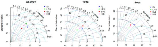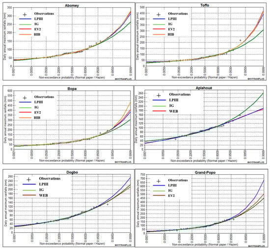 | [35] | lower Ouémé valley (Benin) | 9 | 39 years (1981 to 2019) | GEV, GUM, LN, WEB, GAM | - | AIC, BIC | The results obtained show that the Gumbel, Lognormal, and GEV distributions are the most suitable for the data series in the study area. |