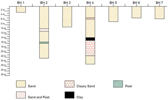 Figure 3 presents lithological profiles derived from the borehole logs, illustrating the vertical stratification of sediments at each location. These logs revealed a sandy layer approximately 30–40 m thick, interspersed with impervious clay or peat lenses at depths of up to 15 m. Such heterogeneity in subsurface composition plays a key role in influencing infiltration and recharge processes. Groundwater monitoring data from 2002 to 2006 further indicated seasonal fluctuations of the water table between 0.7 and 0.9 m, with groundwater depths ranging from 4.9 to 6.1 m below ground level [33]. This information provided a foundational understanding of the natural groundwater dynamics in the study area.
