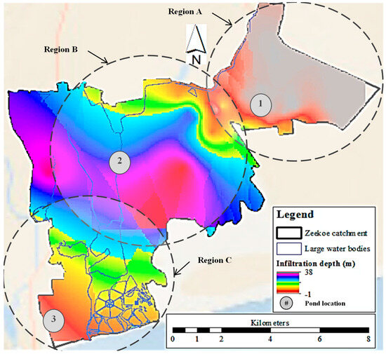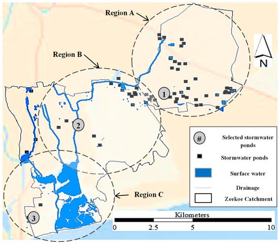 To support the infiltration experiments, three representative stormwater ponds were selected and spatially distributed across the Zeekoe Catchment (Figure 4). Each pond was chosen to represent a distinct region of the catchment (Regions A, B, and C), capturing local variations in hydrological and surface conditions. The selection was guided by a combination of factors, including accessibility, site integrity, security, and the practical feasibility of conducting fieldwork.