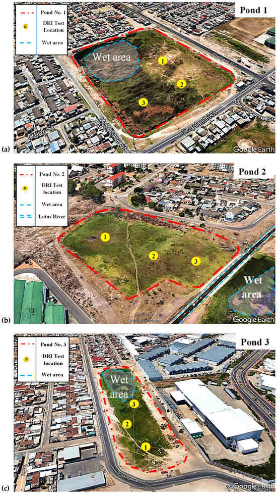 Each pond exhibited distinct surface and subsurface characteristics that influenced test site selection and infiltration performance. In Ponds 1 and 3, localised wet zones restricted field testing in some areas. These persistently saturated patches—likely caused by shallow water tables or compacted, low-permeability soils—were observed in the northwestern sections of both sites (Figure 5a,c). In contrast, Pond 2 (Figure 5b) remained completely dry during the field campaign and is bordered by the channelised Lotus River, with no visible wet areas at the time of testing.