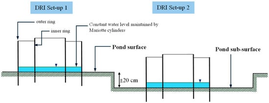 Figure 6 and Figure 7 illustrate the DRI apparatus and experimental setup. Figure 6 presents the standard schematic of the test equipment, including the Mariotte cylinders used to maintain a constant hydraulic head. Figure 7 depicts the two specific field configurations used: surface testing (Setup 1) and sub-surface testing (Setup 2), the latter involving excavation to 20 cm depth to eliminate surface sealing effects and assess deeper infiltration potential.