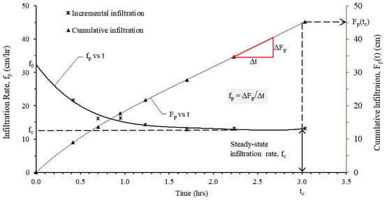 The recorded infiltration data were used to generate cumulative infiltration (Fp) and incremental infiltration (fp) versus time plots, aiding in the estimation of infiltration parameters (Figure 8). Cumulative infiltration represents the total volume of water absorbed by the soil over time, while incremental infiltration refers to the volume infiltrated per unit time. The steady-state infiltration rate (fc) was derived from the slope of the linear portion of the cumulative infiltration curve.