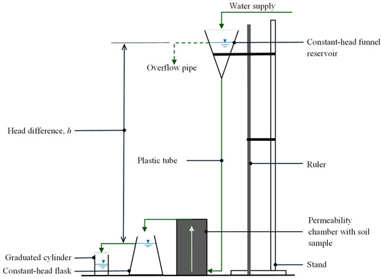 The overall CHP testing system, including water supply, flow direction, and sample assembly, is illustrated in Figure 9. This system allowed for the consistent application of a constant hydraulic head across the soil sample to assess saturated hydraulic conductivity. Each soil specimen was compacted at its respective field bulk density before testing.