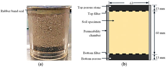 To conduct the tests, a specially constructed permeability chamber was used to hold the soil specimen in place during saturation and testing. The chamber configuration and dimensions are shown in Figure 10, which also includes an image of a prepared soil specimen inside the chamber. This arrangement ensured uniform flow through the sample and allowed for accurate hydraulic conductivity measurements under steady-state flow conditions.