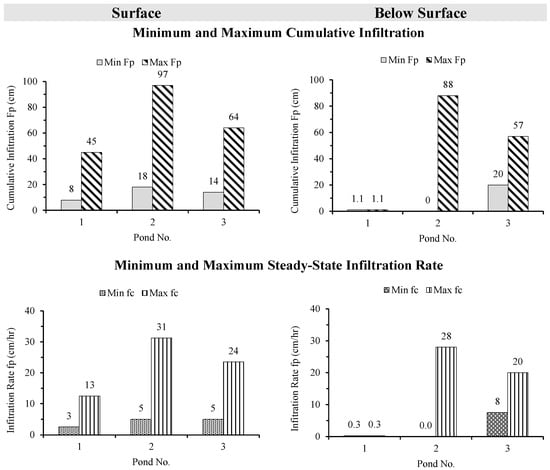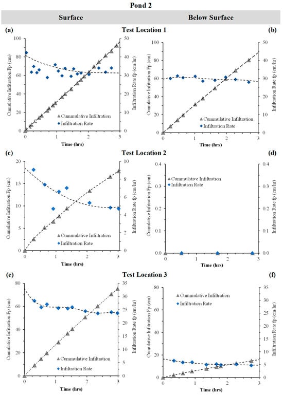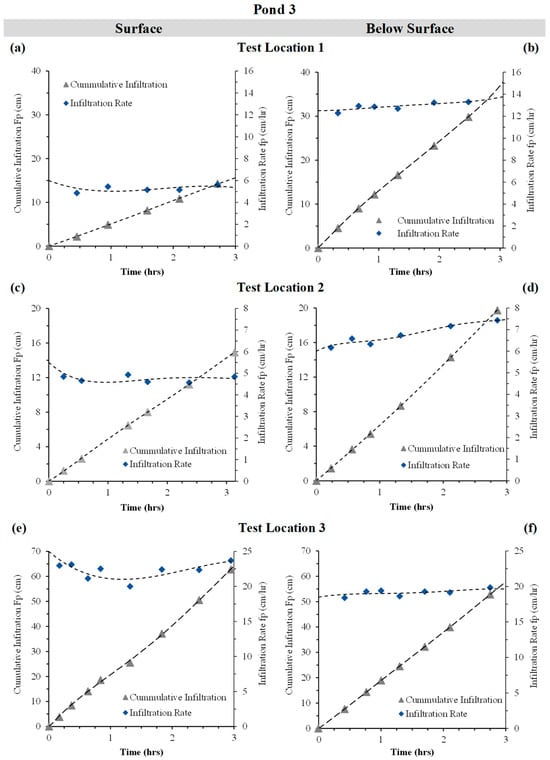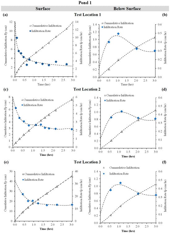 The results from six infiltration tests conducted in Pond 1—three at the surface and three at the sub-surface level—are presented in Figure 16, showing cumulative infiltration (Fp) and infiltration rate (fp) over time for Pond 1 at surfaces of test location 1, 2 and 3 (Figure 16a, c and e respectively) and below surfaces for test location 1, 2 and 3 (Figure 16b, d and f respectively)—see details in Figure 5a. Surface tests followed a typical trend, with infiltration rates decreasing rapidly during the first hour and stabilising thereafter between 2.5 and 12.5 cm/h. Corresponding cumulative infiltration curves rose sharply at first and then plateaued, reaching between 8 and 45 cm after three hours.