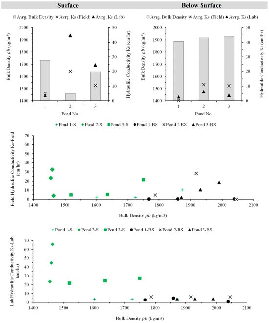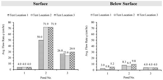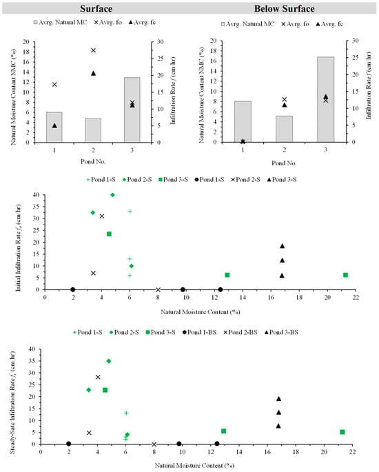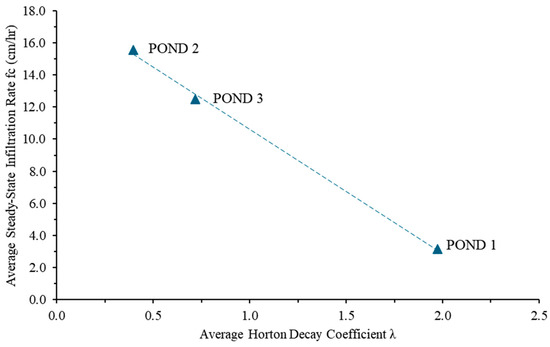 Field infiltration tests using the Double-Ring Infiltrometer (DRI) revealed significant variability in infiltration rates and hydraulic conductivity (Ks) across the three ponds. Horton’s and Green–Ampt methods were employed to estimate infiltration decay coefficients (λ) and hydraulic conductivity (Ks), respectively, providing insights into infiltration dynamics over time. Steady-state conditions were achieved at all investigated locations within three hours.