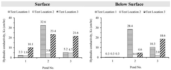 At each of the three selected stormwater ponds, six infiltration tests were performed—three on the surface and three on the sub-surface—yielding a total of 18 tests. Test sites within each pond were selected to capture spatial variability, including differences in vegetation cover and surface conditions. Surface vegetation was cleared at sub-surface locations to reduce biological interference and isolate soil texture and compaction effects.