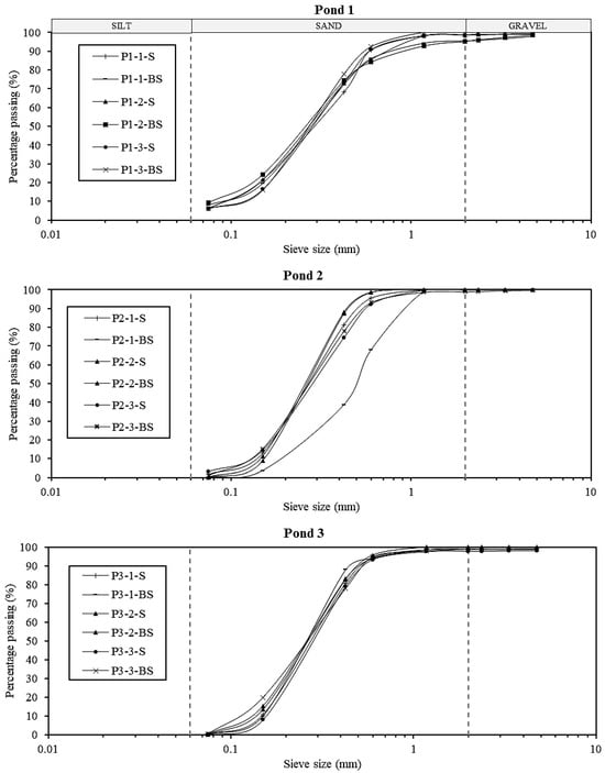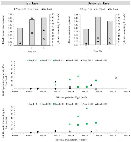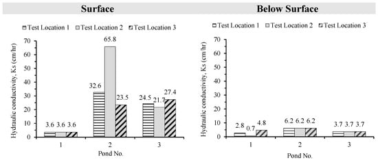 Pond 3 displayed similar CV values for both surface and sub-surface tests, suggesting homogeneous soil properties. These results confirm that field tests capture in situ heterogeneity, whereas laboratory tests provide controlled permeability estimates. Following ASTM [23], Ks is best considered an index property akin to moisture content and particle size distribution due to its sensitivity to boundary conditions.