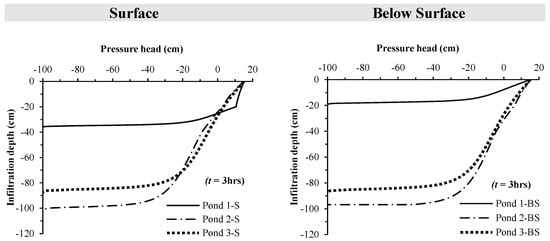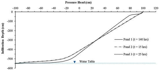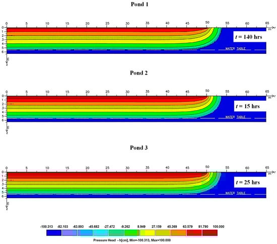 The simulation time ranged from 15 to 140 h, depending on the infiltration characteristics of each pond. Variability was linked to site-specific factors such as initial moisture content and soil permeability. The simulations continued until the wetting front reached the water table. A summary of the numerical model parameters and boundary conditions is presented in Table 3.