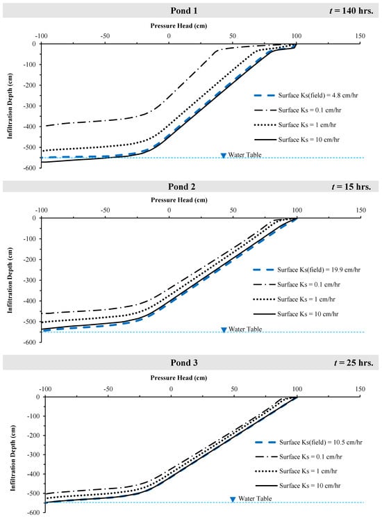 The most restrictive scenario across was the 20 cm sandy clay surface crust layer (Ks = 0.1 cm/h), which significantly delayed the wetting front reaching the water table. The time increased by 53 h in Pond 1 (140 to 193 h), 3 h in Pond 2 (15 to 18 h), and 2 h in Pond 3 (25 to 27 h).