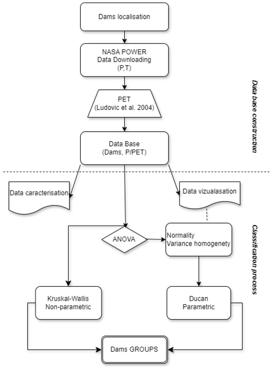 Classifying dams is important to ensure proper management, safety, and maintenance based on their size, purpose, and risk level. This helps in planning for emergency responses, structural inspections, and efficient water resource utilization. This study used the analysis of variance (ANOVA) technique to categorize the main Tunisian dams according to their precipitation to potential evapotranspiration (P/PET) ratio. The data were obtained from the NASA POWER platform, with potential evapotranspiration estimated using the Oudin model. Despite the violation of the normality assumption, the robustness of the ANOVA test for classification purposes remained unaffected. A comparison between Duncan’s test (parametric) and the Kruskal–Wallis test (non-parametric) revealed similar class structures, although Duncan’s test provided greater precision. The analysis identified four primary dam classes, reflecting regional differences in water availability and evaporative demand, and included dams in north-west Tunisia, considered the ‘water tower’ of the country, and those in semi-arid and arid regions.