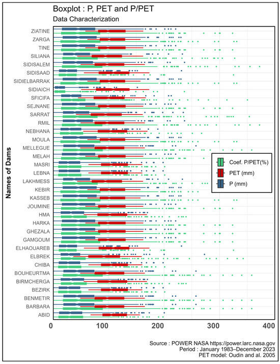 Regarding the P/PET ratio, although the corresponding observations exhibit numerous extreme values similar to those for P and PET, the box plot indicates that most values remained below the 100% threshold, often falling as low as 50%. This highlights the deficit of precipitation relative to potential evapotranspiration, reflecting the arid climatic conditions and the water stress of the region.