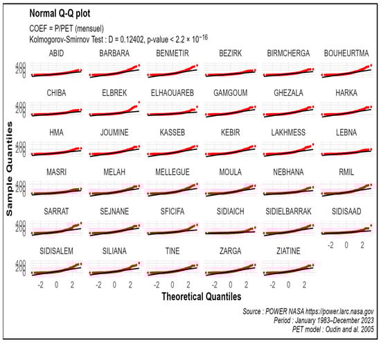 Figure 4 shows all plots of theoretical quantiles and quantiles relative to the coefficient (P/PET) for each group (Dams). The Kolmogorov–Smirnov test was applied to the whole sample. The p-value was very low (less than 2.2 × 10−16), rejecting the normality hypothesis. In addition, these graphs show a shift with respect to the theoretical curves. Consequently, the sample adopted here of P/PET values for each dam was considered to be non-normal.