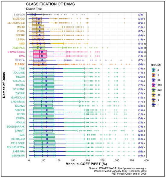 As shown in Figure 5 and Figure 6, the ordinate axis indicates the nomenclature of the dams, which are categorized according to the classes derived from each test (Kruskal–Wallis and Duncan’s tests). Each class is distinguished by a distinct color. The abscissa axis represents the coefficient related to the P/PET ratio, expressed monthly and as a percentage. Each figure is accompanied by a box plot for each dam, together with an error bar plot, with a blue point representing the mean and a blue line segment representing the standard deviation (SD). Each box plot is assigned a color corresponding to the post-test classes. Numbers (1) to (35) denote those assigned to each dam (Figure 2). Each group is identified by one or more lower-case letters.