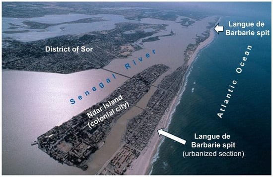 The city of Saint-Louis is located in the estuary of the Senegal River, approximately 30 km from the former river mouth (Figure 2). Saint-Louis has a distinctive geographic location, surrounded by the Atlantic Ocean and the Senegal River. In 2000, Saint-Louis, which is commonly referred to as the “Venice of Africa” was designated a World Heritage site by the United Nations Educational, Scientific, and Cultural Organization (UNESCO).