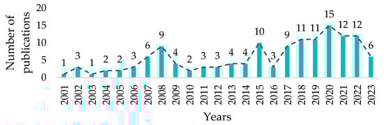 - Data analysis: A WoS data analyzer was employed to discern scientific production trends over time and identify key research areas of focus []. Graphical representations of bibliometric maps were created using the VOSviewer visualization software, version 1.6.19, developed by Jan Van Eck and Ludo Waltman []. VOSviewer is frequently used in bibliometric analyses to visualize bibliometric networks [,,,]. This utility is attributed to its functionality in constructing maps and groupings, either by the density of nodes or the distance between them, which signifies the relationships among the nodes []. The *.txt file exported from the Web of Science database was input into VOSviewer to generate these maps.