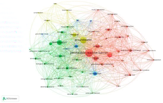 Keyword co-occurrence network map illustrating the most important topics related to permeable reactive barriers, groundwater, and nitrate.