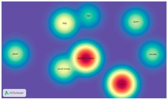 A citation analysis was conducted to identify the countries most cited in this research area. A threshold of at least five documents per country was set, including eight countries out of thirty-seven. The density visualization for citations (Figure 8) indicates that the United States has the highest number of citations, totaling 3306, followed closely by China, with 3191. Other notable contributions include Italy with 486 citations, South Korea with 331, Spain and Japan with 207, Canada with 153, and Iran with 95.