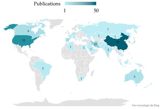 Regarding document contributions, China has the highest number of publications, accounting for 50 documents. The United States follows with thirty-three publications, South Korea with twelve, Iran with ten, Spain with eight, Italy with seven, and Canada contributing with six. Most of the document production is concentrated in Asia. However, North American countries, specifically the United States and Canada, contributed significantly, with 38 documents. With two documents, Brazil is highlighted as the sole Latin American country contributing to this field (Figure 9).