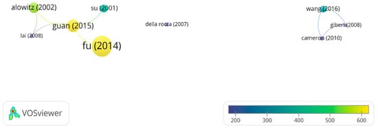 Furthermore, a density view and an element label of the nodes were used to depict the results. The density view is instrumental in visualizing the significance of the map’s most prominent areas or elements. Here, the color intensity of a map area correlates with the concentration of elements in a node and the relevance of its neighboring elements. The areas of greatest density represent higher importance, denoting a more extensive accumulation of documents or citations and their interconnectedness. Furthermore, in the label view, elements are represented by points or nodes. The size of each node reflects its significance within the overall map. Clusters or groups are formed through the relationships between these nodes, where the thickness of the lines connecting the nodes indicates the strength of their relationship and level of agreement [].