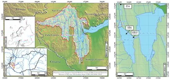Location of KBWPS and its catchment area and the main reservoirs of Kis-Balaton (KBWPS I—Lake Hídvégi and KBWPS II—Lake Fenéki) with some monitoring points (z14, kb4, and kb10—data of these were used in our investigations).