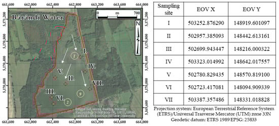 The current sediment sampling sites (I–VII) with coordinates and the previous ones (1, 2, and 9—[]) at Lake Kis-Balaton, Bárándi water area. The presumed main flow directions [,] are represented by arrows.