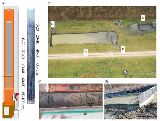 (A) Experimental sediment column and core sample (III); (B) arrangement of the pilot desiccation and dehydrating pad with polyacrylamide addition: (a) a settling pit (b) with inflow (c) and outflow (d) (north—at sampling site I); (C) photographs of column V at the end of the experiment, and (D) shows the desiccated sediment on site.