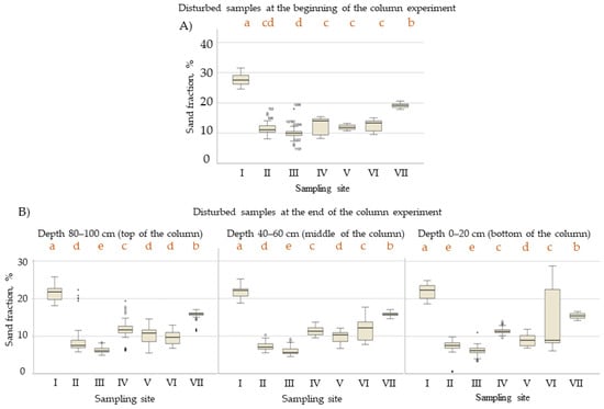 Based on basic statistics (Table A2), the sediment was dominated by the silt fraction. Levene’s test between sampling sites was significant (p < 0.01—Table A4); thus, the Tukey test was used to compare the mean sand content of samples (p < 0.05). The results of the univariate analysis (Figure 4; basic statistics—Table A2) showed that the sand content of disturbed samples I and VII was somewhat higher (mean: 19.2 and 27.8%) than samples IV, V, and VI (mean: 10.0–13.2%). Sediment samples II and III and V and VI contained more clay-sized particles (25.9–30.6%), in contrast to samples I and VII (17.9 and 25.3%) (Table A2). No displacement of the fine fraction was observed in the column experiment (Figure 4A,B).