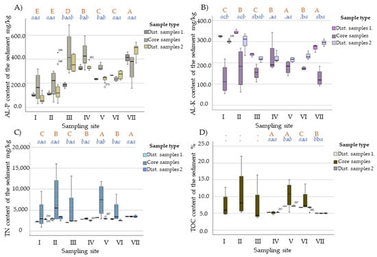 Significant differences were found between the measured nutrient content of the disturbed sediment samples at various sampling sites, primarily in the AL-P content, but it can be also seen in the case of AL-K and TOC contents (only the IV–VII samples were compared) and sometimes in TN contents (post hoc and Tukey’s test results in Figure 5).
