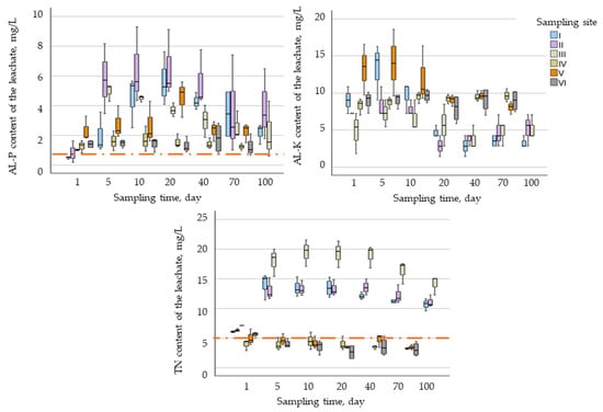The nutrient content of leachates taken at different times (within 100 days) The dashed red line shows the water quality regional limits for the direct recirculation of treated wastewater in the Balaton catchment area in Hungary (Decree No. 28/2004 (XII. 25.) for “Direct receivers of Lake Balaton and its catchment area”).
