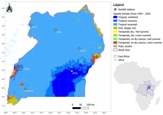 The study area was Uganda, which is located in the East African region (Figure 1). The country is distinguished by its diverse climatic zones and varied topography. According to the Köppen–Geiger global climate classification raster data file by Beck et al. [] for the 1991–2020 period, Uganda features nine distinct climatic zones. The country predominantly experiences a bimodal rainfall regime, characterized by two rainy seasons—March to May and September to November—though regional variations exist, as noted by Ngoma et al. [] and Jury []. According to Ngoma et al. [], the annual rainfall across Uganda ranges widely from 750 to 2500 mm, with mean annual precipitation typically falling between 800 and 1500 mm. Higher rainfall is observed in the highland areas, while semi-arid regions in the east receive lower amounts. Temperatures in Uganda remain relatively moderate, with average annual values ranging from 20 °C to 27 °C, shaped by altitude and local weather patterns [,]. The country’s terrain is equally diverse, encompassing towering mountains and low-lying plains. Notable peaks include the Rwenzori Mountains in the southwest, rising to about 5109 m, and Mount Elgon in the east, reaching about 4321 m as noted by Ngoma et al. [,]. These climatic and topographical variations make Uganda an ideal region for studying RSR bias correction in both gauged and ungauged catchments.
