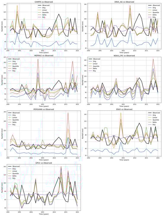 Each bias correction method was applied to all seven RSR dataset products from four gauged stations, with validation extended to two additional stations. Below, the methods are described, highlighting their applicability.