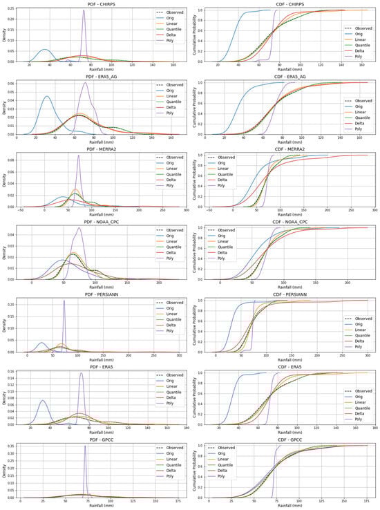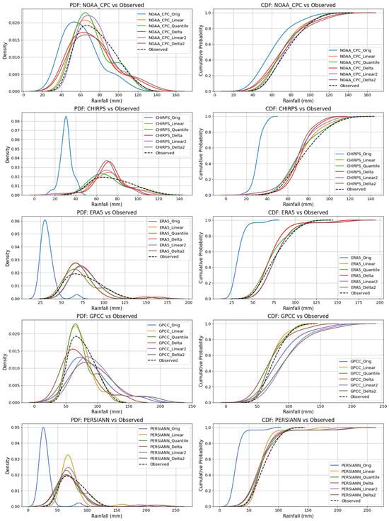 The visual assessment of bias correction methods uses the time series plots and PDF/CDF curves to compare observed rainfall, uncorrected RSR data, and bias-corrected RSR datasets. These plots enable visual assessments on how well the bias corrected data reflect temporal patterns, yearly changes, and extreme events relative to actual observations, revealing any major deviations. The PDF comparison evaluates bias correction performance by showing how RSR data are distributed and how different the distribution is from that of observed rainfall data. A good method aligns the RSR-corrected PDF’s shape, spread, and peak with the observed PDF, while deviations, shifted peaks, or distorted spread indicate under- or over-correction, potentially skewing variability or extremes. The CDF comparison examines the cumulative probability of rainfall amounts, assessing how well the corrected data matches the observed frequency distribution. An effective method keeps the corrected CDF close to the observed one, whereas shifts or slope differences suggest issues like missing extremes or misrepresented frequencies.